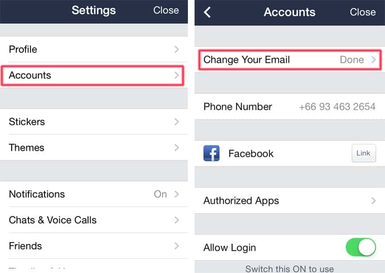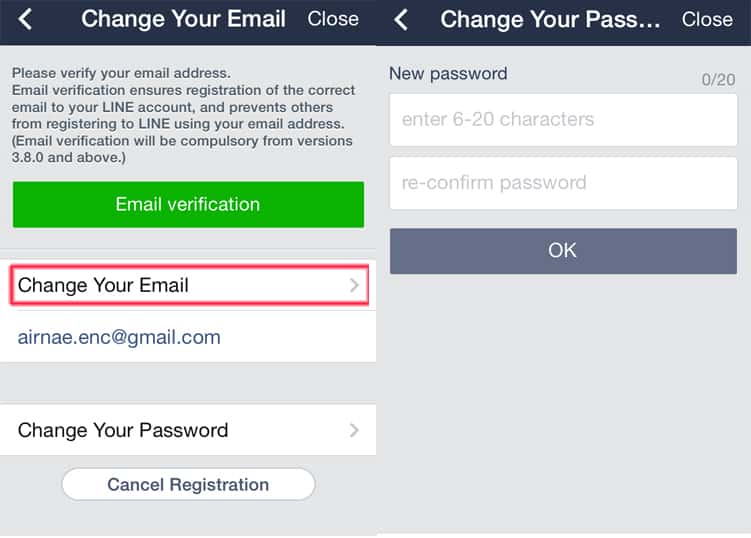 - เปิดแอพฯ LINE จากนั้นเข้า settings> accounts > email registration > change password