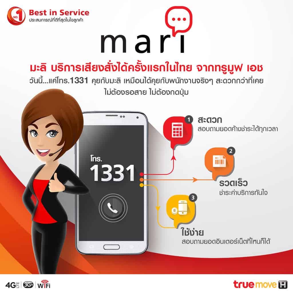 แต่เดิมการโทรหา Call Center แต่ละครั้ง เรามักเจอกับปัญหาหงุดหงิดกวนใจจากการถือสายรอนาน หากต้องการจะใช้บริการใดบริการหนึ่ง ก็ต้องรอฟังและคอยกดหมายเลขตามเมนูที่เสียงตอบรับอัตโนมัติบอก หากกดผิดก็ต้องย้อนกลับไปฟังเมนูเดิมอีกรอบเพื่อกดใหม่ กว่าจะจัดการปัญหาหรือธุระที่ต้องการเสร็จสิ้นก็เสียเวลาไปมากแล้ว แต่เมื่อมี Truemove H Mari (มะลิ) บริการรับคำสั่งเสียงภาษาไทยรายแรกในไทยจาก True Move H ที่ให้บริการผ่าน Truemove H Care หมายเลข 1331 จะช่วยขจัดทุกปัญหาที่เราเคยเจอกับ Call Center เพียงแค่เราแจ้งกับ Mari ด้วยประโยคสั้นๆชัดเจนว่า มีปัญหาอะไร หรือต้องการใช้บริการอะไร มะลิก็จะมวลผลและรับคำสั่งของเราในทันที ทำให้ลดขั้นตอนได้มากขึ้น ใช้เวลาน้อยลง จัดการธุระของเราได้อย่างรวดเร็ว และไม่ว่าอยู่ที่ไหนก็สามารถคุยกับมะลิได้ แต่ควรจะต้องพูดให้ชัดเจน และพยายามไม่ให้มีเสียงสิ่งแวดล้อมอื่นๆมาแทรกในขณะที่เรากำลังสนทนากับคุณ มะลิ เพื่อการใช้งานที่มีประสิทธิภาพที่ดี