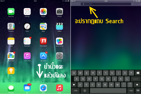 ให้อยู่หน้า Home Screen แล้วนำนิ้วมาแตะที่จอว่างๆแล้วปัดลง จะขึ้นแถบ Search ด้านบนแบบนี้