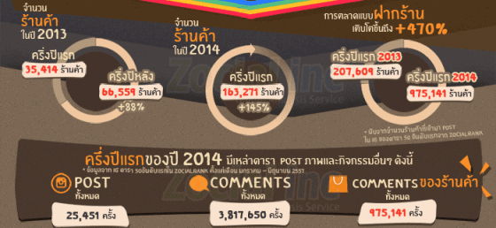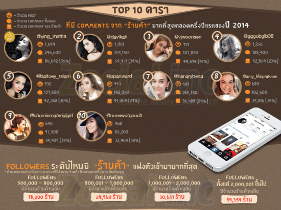 มีดาราโพสภาพบน Instagram ทั้งหมด 25,451 ครั้ง ในช่วงครึ่งปี 2014 (นับเฉพาะ 50 อันดับดาราจาก ZocialRank เท่านั้น) มี Comment เกิดขึ้นทั้งหมดกว่า 3,817,650 ครั้ง โดย Comment ที่เป็นของ “ร้านค้า” มีกว่า 975,141 ครั้ง หรือกว่า 26% เลยทีเดียว จึงเป็นสาเหตุที่ ดาราประกาศออกงดฝากร้านกันมากขึ้น