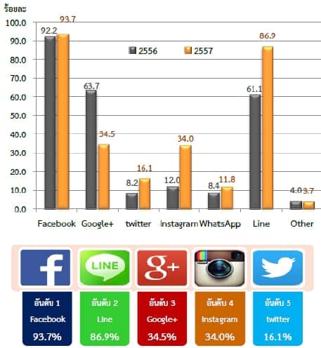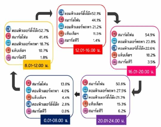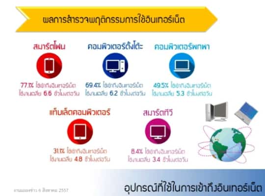 - ผ่านทางสมาร์ทโฟน จะนิยมเข้าใช้พวก Social Network มากที่สุดเป็นอันดับ1 ,ส่วนอ่านข่าว อ่านอีบุ๊ค มาเป็นอันดับ 2 และ ค้นหาข้อมูล เป็นอันดับที่ 3