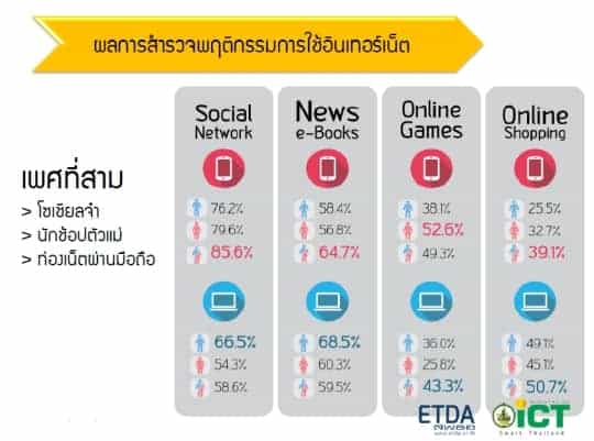 - กลุ่มเพศที่ 3 กว่า 200 กว่าราย กลับนิยมเล่นทั้ง Social Network , อ่านข่าว และ นักช้อปปิ้งออนไลน์ มากกว่าเพศชายและเพศหญิง