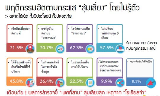 นอกเหนือจากข้อมูลสถิติพฤติกรรมการใช้งานอินเทอร์เน็ตในไทยแล้ว ยังมีข้อมูลเกี่ยวกับ สถิติพฤติกรรมสุ่มเสี่ยงบนโลกอินเทอร์เน็ต ด้วย ซึ่งประชาชนส่วนใหญ่ขาดความรู้ขาดความตระหนักด้านความปลอดภัยบนโลกไอทีและอินเทอร์เน็ต