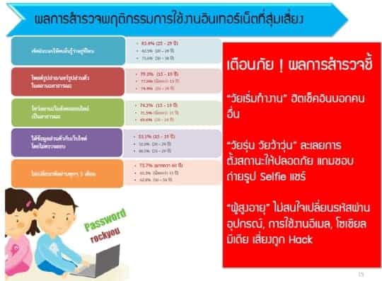 - กลุ่มผู้สูงอายุไม่สนใจเปลี่ยนรหัสผ่านบนอุปกรณ์ไอที หรือพวก Social Media เลย ซึ่งมีโอกาสเสี่ยงโดนแฮกสูง ซึ่งมากถึง 75% ที่ไม่ยอมเปลี่ยนรหัสเลย