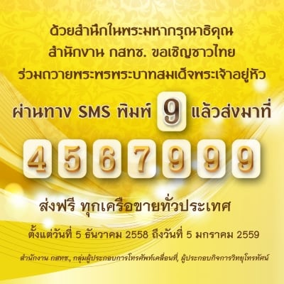 ทางสำนักงาน กสทช. เชิญชวนประชาชนร่วมส่ง SMS ผ่านโครงการ “ กด 9 ถวายพระพร ” โดย พิมพ์ 9 แล้วส่งไปที่ 4567999 ไม่มีค่าใช้จ่ายทุกเครือข่าย (เฉพาะการส่งภายในประเทศเท่านั้น) ในช่วงระหว่างวันที่ 5 ธันวาคม 2558 จนถึงวันที่ 5 มกราคม 2559