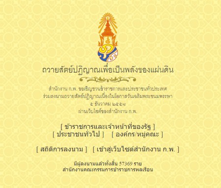 อีกช่องทางนึงคือ ผ่านทางเว็บไซต์กระทรวงเทคโนโลยีสารสนเทศและการสื่อสาร (กระทรวงไอซีที) ซึ่งได้จัดทำหน้าเว็บไซต์ให้ประชาขนได้ร่วมลงนามถวายพระพรฯ ออนไลน์ และสามารถสแกนบาร์โค้ดผ่านทางแอพ Line จากนั้นเลือกการ์ดลงนาม (มีให้เลือก 9 แบบ ) และเลือกคำถวายพระพร 5 แบบ โดยสามารถลงนามถวายพระพรได้ที่ www.ourking.org หรือผ่านทางเว็บไซต์ในสังกัดกระทรวงไอซีที