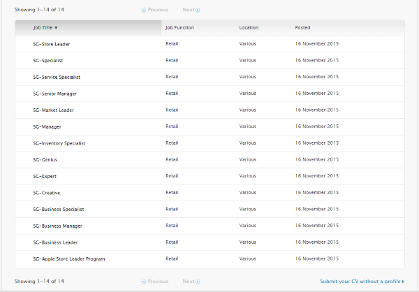 และในหน้ารับสมัครงานบนเว็บไซต์ Apple ก็เปิดรับสมัครงานตำแหน่งพนักงานประจำสาขาสิงคโปร์ ซึ่งก็รวมถึง Apple Store ด้วย ประกอบด้วยตำแหน่ง หัวหน้า, ผู้จัดการ, และตำแหน่งอื่น ๆ รวม 14 ตำแหน่ง