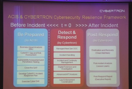 “ จากแนวความคิดที่ว่าเราไม่อาจหลีกเลี่ยงการโจมตีทางไซเบอร์ได้ และ ระบบรักษาความมั่นคงปลอดภัยในรูปแบบเดิมไม่สามารถป้องกันการโจมตีรูปแบบใหม่ ที่ใช้เทคนิคการโจมตีขั้นสูงถึงร้อยเปอร์เซ็นต์ ดังนั้น องค์กรจึงจำเป็นต้องปรับกลยุทธ์ด้านความมั่นคงปลอดภัยไซเบอร์ โดยเน้นหนักไปยังการตรวจสอบ เฝ้าระวัง และ การตอบสนองต่อภัยคุกคามให้ได้อย่างทันท่วงทีบริการ Cyber 911 ศูนย์เฝ้าระวังภัยคุกคามด้านความมั่นคงปลอดภัยไซเบอร์รูปแบบใหม่ (Next Generation Security Operation Center) ของไซเบอร์ตรอนสามารถตอบสนองต่อความจำเป็นดังกล่าวได้อย่างครบถ้วนโดยการวิเคราะห์สภาพแวดล้อม ลักษณะ และ โครงสร้างการปฏิบัติงานกำหนดรูปแบบความเสี่ยง และ ภัยคุกคามที่เป็นเอกลักษณ์เฉพาะของแต่ละองค์กรรวมถึง การจัดทำแผน และ ขั้นตอนการตอบสนองต่อภัยคุกคามพร้อมด้วยบุคลากรที่มีความเชี่ยวชาญในการตรวจสอบ และ เฝ้าระวังภัยคุกคาม ที่พร้อมจะตอบโต้ต่อภัยคุกคามได้อย่างทันท่วงทีตามหลักการ Responsive Security ” อาจารย์ปริญญา หอมเอนก กล่าว