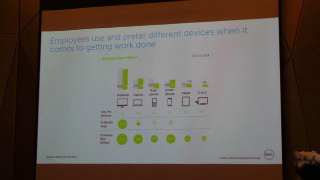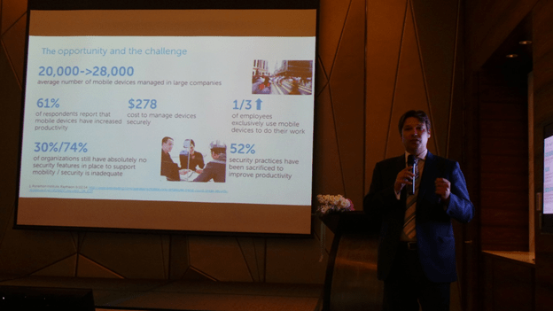 Mr.James Johnston กรรมการบริหารและผู้จัดการทั่วไป ฝ่ายโซลูชันไคลเอนด์ เดลล์ ภาคพื้นเอเชียแปซิฟิกและญี่ปุ่น เผยข้อมูลสถิติที่น่าสนใจว่า จากผลการสำรวจพนักงาน จาก 12 ประเทศในปี 2014 เกี่ยวกับการใช้เทคโนโลยีกับการทำงาน พบว่า 1 ใน 3 ของพนักงานทั้งหมดใช้สมาร์ทโฟนและแท็บเล็ตในการทำงาน โดย 61% บนสมาร์ทโฟนและแท็บเล็ตของพนักงาน จะพบแอพที่ใช้ช่วยในการทำงานอยู่ด้วย หากรวมจำนวน Mobile Device ที่นำมาใช้ในองค์กรต่างๆ จะมี Mobile Device มากถึง 20,000-28,000 ตัว ต่อ 1 บริษัทเลยทีเดียว แต่การรักษาด้านความปลอดภัยข้อมูลในบริษัทก็ยังไม่เพียงพอ โดยบริษัทส่วนใหญ่ยังไม่มีระบบสนับสนุนความปลอดภัยบนอุปกรณ์พกพา