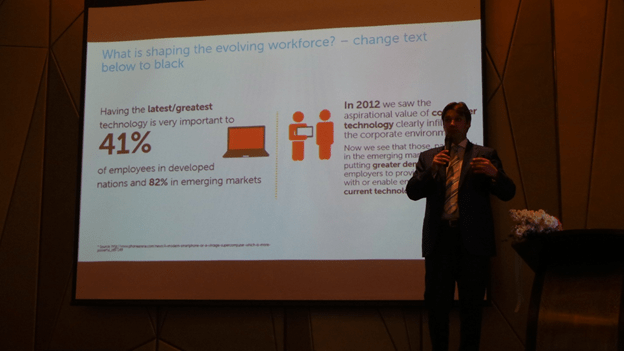 41% ของพนักงานในประเทศที่พัฒนาแล้ว และ 82% ของตลาดเกิดใหม่ เชื่อว่า การที่เรามีเทคโนโลยีที่ทันสมัย จะมีส่วนสำคัญอย่างมากในการทำงาน ทั้งบริการคลาวด์และระบบบริหารจัดการอุปกรณ์ต่างๆนั้น สร้างความสะดวกและเพิ่มประสิทธิภาพให้กับการทำงาน และแนวโน้มการนำดีไวซ์ส่วนตัวมาใช้งาน หรือ BYOD ก็เป็นเทรนด์ใหม่ที่มีการใช้จริงในบริษัทมากขึ้น บริษัทและองค์กรจำเป็นต้องลงทุนเพื่อจัดการเรื่องนี้ เพราะความปลอดภัยของข้อมูลบนมือถือและแท็บเล็ตนั้น ต่ำมาก ถ้าเทียบกับ Desktop และ Laptop