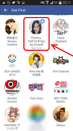 - เลือกโพสต์จากเพื่อนหรือเพจที่ชื่อชอบให้สามารถดูได้เป็นอันดับแรกใน Feed ( ยกตัวอย่างติดตามเพจ iT24Hrs ก็เลือกตามดังรูปนี้ ให้ขึ้นเครื่องหมายดาว และข้อความด้านล่างจะปรากฎ See First ด้วย )