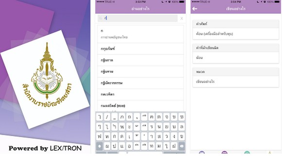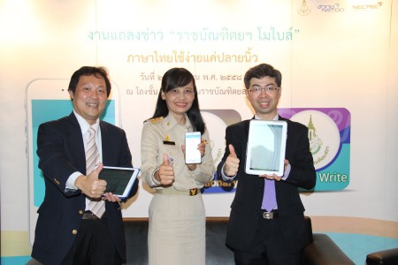 ดร.ศรัณย์ สัมฤทธิ์เดชขจร ผู้อำนวยการศูนย์เทคโนโลยีอิเล็กทรอนิกส์และคอมพิวเตอร์แห่งชาติ ( NECTEC ) กล่าวถึงความร่วมมือกับสำนักงานราชบัณฑิตยสภา..ว่า นับเป็นอีกก้าวหนึ่งของเนคเทคที่ได้นำผลงานการวิจัยที่ใช้เทคโนโลยีด้านภาษาธรรมชาติและความหมายมาพัฒนาแอปพลิเคชันพจนานุกรม ฉบับราชบัณฑิตยสถาน พ.ศ. ๒๕๕๔ ที่ได้ประมวลคำที่มีใช้ในภาษาไทยกว่า ๔๓,๐๐๐ คำ การแสดงผลการใช้งานมี ๒ รูปแบบ คือ รูปแบบหมวดอักษร และ รูปแบบการค้นคำ ผู้ใช้สามารถค้นคำได้ทั้งจากตัวอักษรตั้งต้นและจากส่วนหนึ่งของคำ ทั้งยังค้นคำจากประวัติการใช้งานของผู้ใช้เองได้ด้วย ส่วนแอปพลิเคชันอ่านอย่างไรและเขียนอย่างไร ฉบับราชบัณฑิตยสถาน ผู้ใช้สามารถเลือกใช้งานได้ ๒ หมวด คือ (๑) “หมวดอ่านอย่างไร” เพื่อทราบคำอ่านที่ถูกต้องและ (๒) “หมวดเขียนอย่างไร” โดยพิมพ์คำที่ต้องการทราบคำอ่านหรือการสะกดคำลงไป แม้ว่าผู้ใช้สะกดคำผิด แอปพลิเคชันนี้ก็แนะนำการสะกดคำที่ถูกต้องให้ นอกจากนี้ ผู้ใช้ยังค้นคำจากประวัติการใช้งานของผู้ใช้เองได้เช่นเดียวกัน แอปพลิเคชันทั้ง ๒ โปรแกรมนี้ ผู้ใช้สามารถดาวน์โหลดได้ทั้งระบบปฏิบัติการ iOS7, iOS8 และ Android ฟรี