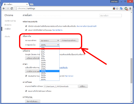 หาในส่วน การซูมหน้าเว็บ บริเวณส่วน เนื้อหาเว็บ ซึ่งจะแสดงระดับการซูมเป็น % อยู่ เลือกระดับการซูมตามต้องการดังรูป