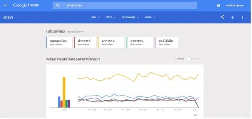สถิติการค้นหาโดย Google Trends เเสดงให้ทราบว่าคนไทยมีการค้นหาข้อมูลเพื่อสำรวจอาการต่างๆ เมื่อสงสัยว่าตนเองกำลังจะเป็นคุณเเม่สูงสุดเป็นอันดับ 1 ในคำว่า “อาการคนท้อง” โดยเปรียบเทียบกับสิ่งที่คนเป็นเเม่มือใหม่ให้ความสนใจ อาทิ คำว่า “ฝากครรภ์” “อาหารคนท้อง” “ของใช้เด็ก” หรือ เเม้กระทั่ง “ชุดคลุมท้อง” ซึ่งได้รับความสนใจจากคุณเเม่รองลงมา เนื่องจากร่างกายที่อวบขึ้นเเละกระเเสแฟชั่นที่คุณเเม่ก็สวยได้ในปัจจุบัน จึงทำให้ชุดคลุมท้องได้รับความสนใจมากกว่าการเตรียมข้าวของเครื่องใช้ให้กับคุณลูก เเละการใส่ใจด้านโภชนาการ รวมถึงการฝากครรภ์ ที่มีอัตราการค้นหาที่ใกล้เคียงกันมาตลอดตั้งเเต่ต้นปี 2558