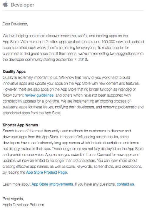 ทั้งหมดนี้ Apple จะเริ่มจัดระเบียบ App Store ตั้งแต่วันที่ 7 กันยายน 2016 เป็นต้นไป ซึ่งตรงกับวันแถลงเปิดตัวสินค้าใหม่ของ Apple พอดี หนึ่งในนั้นคือ iPhone รุ่นใหม่ด้วย ที่คาดว่าจะใช้ชื่อ iPhone 7