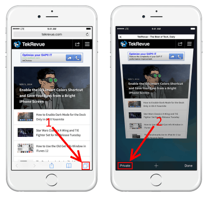 จะเข้าสู่หน้า Private Browsing Mode หากเปิดแท็บใหม่จากหน้านี้ จะแสดงเป็นหน้าต่างสีเทา สามารถชมท่องเว็บได้ตามปกติ โดยจะไม่บันทึกการท่องเว็บใดๆลงบนเว็บเบราว์เซอร์ของคุณ วิธีที่แสดงนี้ใช้ได้บน iOS8 , iOS9