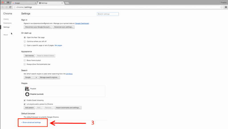จากหน้าจอ settings ให้ดูบริเวณด้านล่างสุด แล้วคลิกที่ Show advanced settings