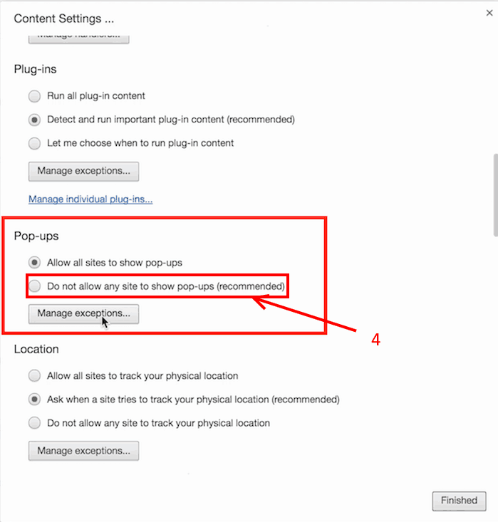 ด้านใต้ในหมวด “Pop-ups,” ให้คลิกที่ Do not allow any site to show pop-ups (recommended) แล้วคลิก Finished ก็จะปิดการแสดง Block Pop-Up Ads ของทุกเว็บไซต์แล้ว