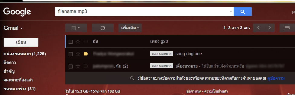 คราวนี้ลองเปลี่ยนสกุล หลัง filename:____ เป็นสกุลอื่นเช่น avi , wmv , wma , zip , rar ไปเรื่อยๆ ซึ่งการค้นหาแบบนี้จะเป็นการค้นหาพวกไฟล์วีดีโอ ไฟล์เสียง ที่ส่งทาง Gmail นั่นเอง ส่วนใหญ่จะเป็นไฟล์เก่าที่เคยเปิดและดาวน์โหลดแล้ว หรือไฟล์ที่เราแนบเองแล้วส่งให้เพื่อน คราวนี้แนะนำให้ลบอีเมลเหล่านี้ทั้งหมดเพื่อเพิ่มพื้นที่ว่าง หากไฟล์ไหนเป็นไฟล์สำคัญ ให้ทำการดาวน์โหลดไฟล์แนบลงคอม ก่อนลบอีเมล