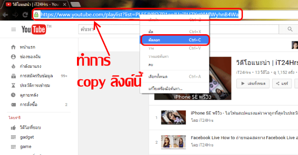 จะเข้าสู่หน้า Playlist ของ วีดีโอแนะนำ | IT24HRS แล้ว คราวนี้ก็ copy ที่อยู่ url link ด้านบนนี้ทั้งหมดเลย