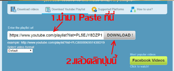 จากนั้นเข้าที่เว็บไซต์ http://www.downvids.net/download-youtube-playlist-videos แล้วทำการ paste วางลิงค์ playlist บน Youtube ที่เรา copy ลิงค์เมื่อสักครู่นี้ลงไป แล้วคลิก Download