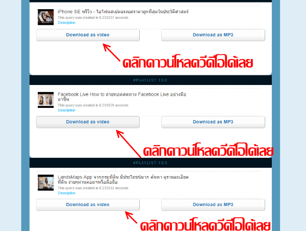 เว็บไซต์ก็จะปรากฎลิงค์วีดีโอทั้งหมดใน Playlist ทีละคลิป ตามจำนวนวีดีโอใน playlist ให้คุณคลิกดาวน์โหลดวีดีโอลงบนคอมแบบง่ายๆ แล้ว โดยเพียงแค่คลิกปุ่ม download as video ก็จะดาวน์โหลดคลิป Youtube เป็น mp4 ให้เลย โหลดเสร็จ ก็คลิกปุ่ม download as video ในวีดีโอตัวต่อไปได้ทันที