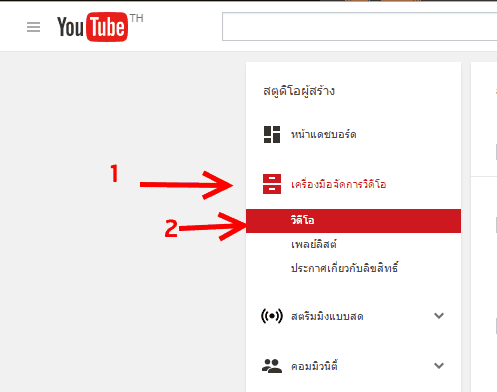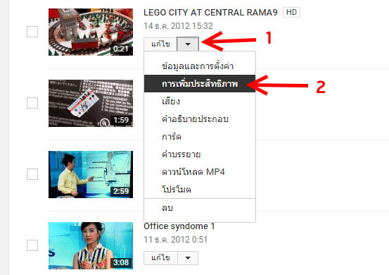 เมื่อเจอวีดีโอที่ต้องการจะใส่เบลอวัตถุแล้ว ก็คลิกที่ปุ่มสามเหลี่ยมชี้ลง ข้างๆปุ่มแก้ไข ดังหมายเลข 1 แล้วเลือกที่รายการ การเพิ่มประสิทธิภาพ