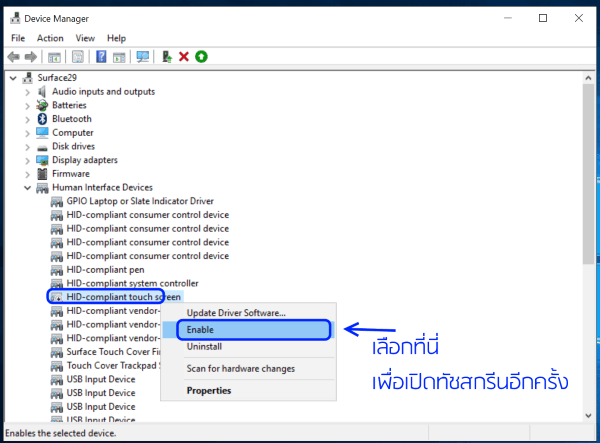แล้วถ้าจะเปิดการรองรับจอทัชสกรีนอีกครั้งทำอย่างไร ก็คลิกขวาที่ “HID-compliant touch screen” แล้ว เลือก Enable จอสัมผัสก็จะรองรับกับนิ้วมือให้คุณจิ้มสัมผัสกับแอปบนหน้าจอได้อีกครั้ง