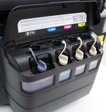 ในส่วนขวามือจะเป็น Ink Tank ความจุสูง ที่ให้เราเติมหมึก ซึ่งใครที่ใช้ Printer ก็คงทราบกันดีว่า การใช้หมึกเติมแบบ Tank จะประหยัดกว่าการซื้อตลับหมึกมาก โดยการเติมแต่ละครั้งสามารถใช้งานต่อเนื่องได้หลายพันแผ่น เหมาะอย่างมากกับการใช้งานในองค์กรที่ต้องพิมพ์เอกสารบ่อยๆ เนื่องจากช่วยประหยัดค่าใช้จ่าย