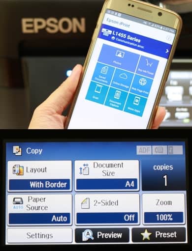 เมื่อลองใช้งาน EPSON L1455 ดู ก็พบว่าสามารถสั่งงานและควบคุมไปพร้อมกับหน้าจอทัชสกรีนสี ซึ่งสามารถกดง่าย โดยเราสามารถเลือกคำสั่ง Print , Scan , Copy , Fax ที่เครื่องได้เลย บริเวณด้านข้างยังมีปุ่มคำสั่ง Print สีและขาวดำให้เลือก จะสีหรือขาวดำ ก็ออกคำสั่งแค่ปุ่มเดียว สะดวกดี และยังรองรับการทำงานแบบไร้สาย คือสามารถเชื่อมต่ออุปกรณ์กับเครื่องพิมพ์ผ่าน Wifi และแอปพลิเคชันบน Smartphone ได้แก่ Epson iPrint โดยสามารถรองรับ 4 อุปกรณ์พร้อมกัน ลองมาดูการใช้งานทีละส่วนกันเลย