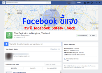 หลังจากที่เมื่อช่วงค่ำของวันที่ 27 ธันวาคม 2559 Facebook Safety Check เกิดแจ้งเตือนว่ามีเหตุระเบิดที่กรุงเทพ แต่ไม่เกิดขึ้นนั้น ล่าสุดทาง facebook ได้ออกชี้แจงสาเหตุกรณี Facebook Safety Check แจ้งเตือนออกมาแล้ว โดยเผยว่าการแจ้งเตือนครั้งนี้เกิดจากข่าว หนุ่มปาระเบิดปิงปองใส่ทำเนียบ