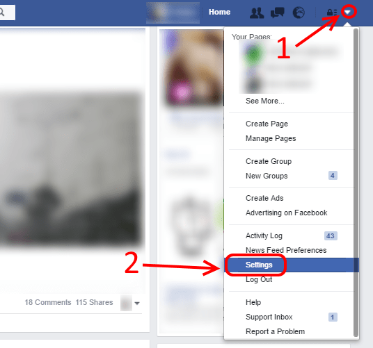 หลังจาก sign in บัญชี facebook ให้เข้าหน้าตั้งค่าโดยคลิกที่ไอคอน 3เหลี่ยมชี้ลง แล้วเลือกที่ Settings ดังรูป