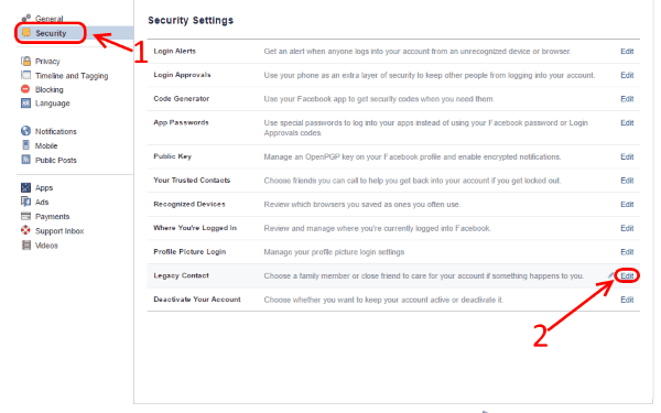 จากนั้นเลือก Security >> แล้วคลิกที่ Edit ในกลุ่ม Legacy Contact ตามภาพ