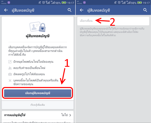 จะปรากฎหน้าจอนี้ ให้เลือกที่ >> เลือกผู้สืบทอดบัญชี >> จากนั้นใส่ชื่อ facebook ญาติ ผู้ปกครอง ของเรา หรือใส่ชื่อบัญชี facebook เพื่อนสนิทที่ไว้ใจ แค่นี้ก็เรียบร้อย