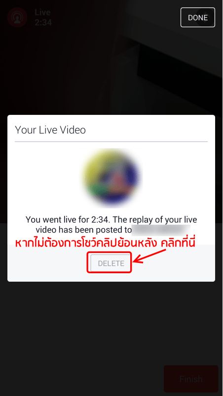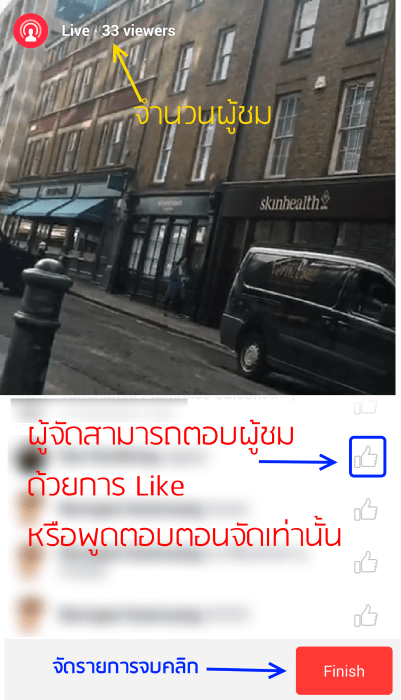ระหว่างถ่ายทอดสดคุณสามารถดูจำนวนผู้ชมถ่ายทอดสดได้ และสามารถ Like เพื่อนๆที่แสดงความเห็นในช่วงระหว่างถ่ายทอดสดได้ด้วย แต่ข้อจำกัดคือผู้จัดไม่สามารถแชตตอบได้ ต้องพูดตอบสดๆเลยเท่านั้น หากคุณจบกิจกรรมถ่ายทอดสดแล้ว ก็แตะที่ Finish เท่านี้ก็จะจบการใช้ facebook live ในครั้งนี้