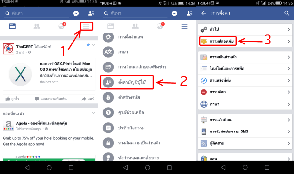 หากคุณเข้าแอพ facebook บนมือถือ ให้แตะที่ไอคอน 3 ขีด แล้วเลือกที่ ตั้งค่าบัญชีผู้ใช้ >> แล้วแตะเลือก ความปลอดภัย