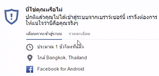 เมื่อตั้งค่าเรียบร้อยแล้ว คราวนี้เมื่อเกิดเหตุมีคน Login เข้า facebook บัญชีของเราผ่านทางอุปกรณ์อื่นๆที่เราไม่เคยใช้ หรือเค้าแอบ Login มาจากที่อื่นละก็ จะปรากฎข้อความแจ้งเตือนนี้ทั้งบนเว็บไซต์และบนแอป facebook และมีจดหมายอีเมลส่งถึงเราคอยรายงานว่ามี คนอื่นแอบ Login เข้าบัญชี facebook เราผ่านอุปกรณ์นี้ใช้ของเราหรือไม่ หากไม่ใช่เราสามารถตอบกลับว่าไม่ใช่เพื่อปิดไม่ให้คนที่แอบใช้บัญชีเราแอบ และเราเองก็ต้องดำเนินการเปลี่ยนรหัส Password ของเราด้วย