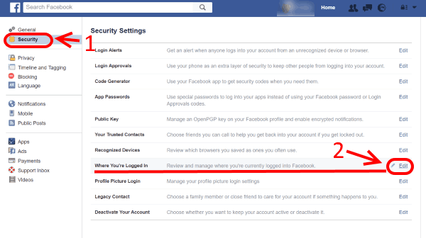 จากนั้นเลือกรายการข้างซ้ายที่ Security แล้วเลือกข้างขวาที่ Edit ตรงแถวบรรทัดที่มีข้อความว่า Where You’re Logged In