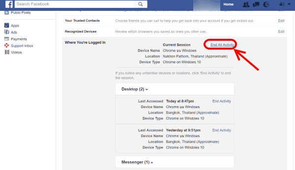 คลิกที่ End All Activity เพื่อ Logout อออจากบัญชี facebook ตัวเองทุกอุปกรณ์ แค่นี้ก็เรียบร้อย