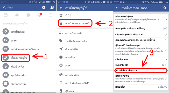 หากคุณใช้งานแอป facebook บนมือถืออยู่ ให้เรียกเมนูด้านซ้าย จากนั้นเลื่อนรายการลงมาแล้วเลือก ตั้งค่าบัญชีผู้ใช้ >> เลือก การรักษาความปลอดภัย >> เลือกที่ สถานที่ที่คุณเข้าสู่ระบบ