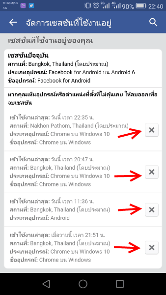 แล้วแตะที่เครื่องหมาย กากบาท X ทุกเซสชั่น แค่นี้ก็ Logout ออกจากบัญชี facebook ตัวเองทุกอุปกรณ์แล้ว