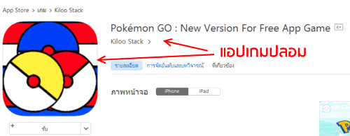โดยแอปปลอม ใช้ชื่อว่า Pokémon Go : New Version For Free App Game พัฒนาโดย Kiloo Stack ขึ้นชาร์ตอันดับ 1 ใน App store ไทย และประเทศอื่นๆอย่างอินโดนีเซีย และอีกหลายประเทศที่ยังไม่เปิด Pokémon Go