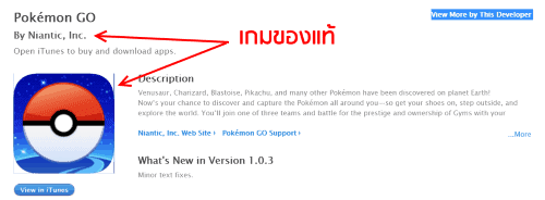 โดยแอป Pokémon Go ของแท้ ต้องพัฒนาโดย Niantic, Inc เท่านั้น ดูตัวอย่างดังภาพบน หรือลิงค์นี้ (จาก App Store สหรัฐ) ซึ่งยังไม่เปิดดาวน์โหลดในไทยในตอนนี้