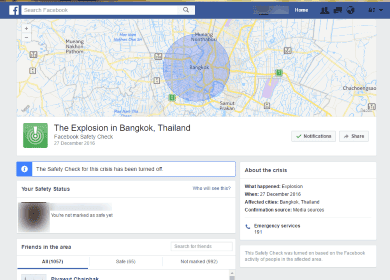 เมื่อช่วงค่ำประมาณ 20.30 น. ชาวกรุงเทพบนโลกโซเชียล ต่างตกใจเพราะได้รับแจ้งเตือนจากระบบเตือนภัย facebook Safety Check ที่จะเตือนเฉพาะเกิดเหตุฉุกเฉินเช่น แผ่นดินไหว เหตุระเบิด เป็นต้นโดย facebook เตือนว่าเกิดเหตุระเบิดบริเวณใจกลางกรุงเทพ แต่เมื่อตรวจสอบเช็คข่าวจากสำนักข่าวต่างๆและ feed บน twitter กลับไม่มีเหตุระเบิดอย่างที่ facebook safety check แจ้งเตือน