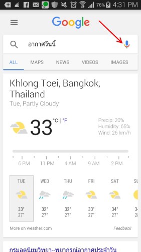 ทีนี้ก็ลองค้นหาโดยกดปุ่มไมค์ บนแอพ Google แล้วพูดสิ่งที่ต้องการค้นหาดู Google ก็จะ ค้นหาด้วยเสียงภาษาไทย แล้ว Google TalkBack จะตอบกลับเป็นเสียงภาษาไทยด้วย ลองพูดบางประโยคบนแอพนี้ดู เช่น อากาศวันนี้ , เวลา , จุดท่องเที่ยว ,พาฉันไปสนามบิน แปลเป็นภาษาอังกฤษ