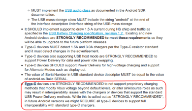 ในเนื้อหาระบุว่า ไม่ควรเปลี่ยนแปลงการจ่ายไฟไปจากมาตรฐาน และในเอกสารระบุว่าควรจะตรวจจับไฟที่ 1.5A และ 3.0A ได้ และต้องคำนวนกระแสไฟในการชาร์จได้ด้วย งานนี้กระทบถึงเหล่าค่ายต่างๆที่กำลังพัฒนา Fast Charge แน่ๆ