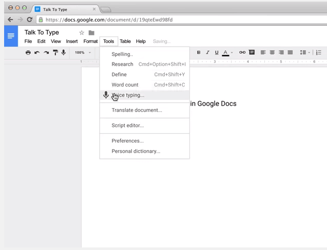 วิธีการคือเข้า docs.google.com บนคอมพิวเตอร์ของคุณ sign in เข้าใช้งานปกติแล้วเลือกเอกสาร Google Docs ที่ต้องการ หรือกด + เพื่อสร้างเอกสารใหม่ จากนั้นก็เข้าไปที่เมนู Tool ( เครื่องมือ)>> เลือก Voice a Typing… (พิมพ์ด้วยเสียง…)