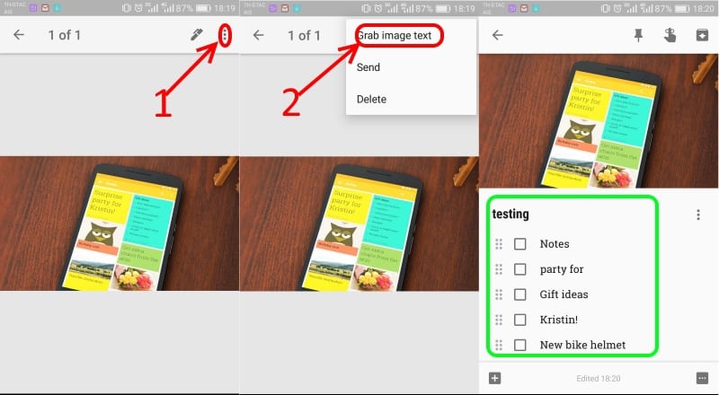 ผลที่ได้คือ Google Keep จะหาข้อความในรูปภาพ แล้วแสดงเป็นข้อความในลักษณะ Text ตัวพิมพ์ อยู่ด้านล่างแบบนี้ (ตามกรอบสีเขียวที่ชี้อยู่ในรูป ) ซึ่งฟีเจอร์นี้ Google Keep อ่านออกแค่ภาษาอังกฤษกับตัวเลขเท่านั้น (ยังไม่รองรับตัวอักษรภาษาไทย) และความแม่นยำนั้นอยู่ประมาณ 70-80%