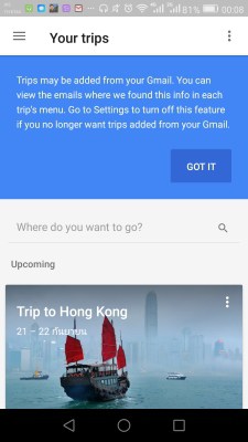 หลังจาก Sign In ด้วยบัญชี Gmail แล้วก็จะพบข้อมูลทริปต่างๆ ทั้งนี้ส่วนใหญ่จะมีทริปเก่าๆบันทึกอัตโนมัติอยู่ด้วย ให้สามารถแตะดูย้อนหลังได้ว่า ณ ตอนนั้นคุณทำอะไรบ้าง หากคุณจองตั๋วทริปในอนาคตละก็ ก็จะมีข้อมูลทริปที่กำลังจะเกิดขึันแสดงขึ้้นมาทันที