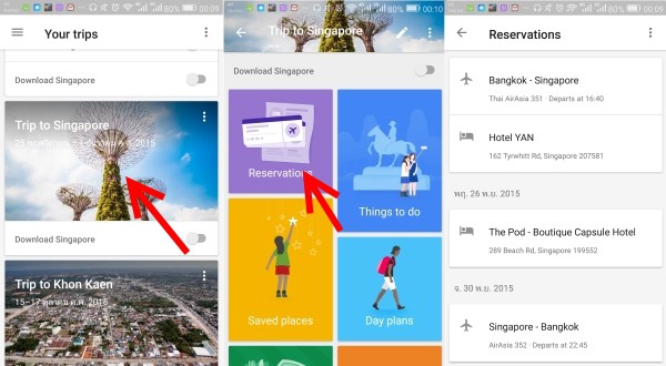 ยกตัวอย่างทริปสิงคโปร์ ก็จะขึ้นหน้าจอหลักตามรูป หากแตะ Reservations ก็จะแสดงข้อมูลที่เคยจองตั๋วเครื่องบิน และตั๋วที่พักด้วย